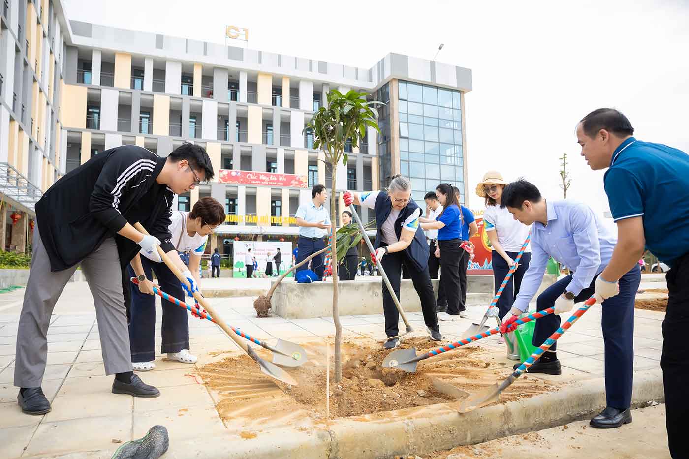Hoạt động trồng cây được triển khai với sự tham dự của đại diện BIDV MetLife, lãnh đạo nhà trường cùng đông đảo giảng viên, sinh viên